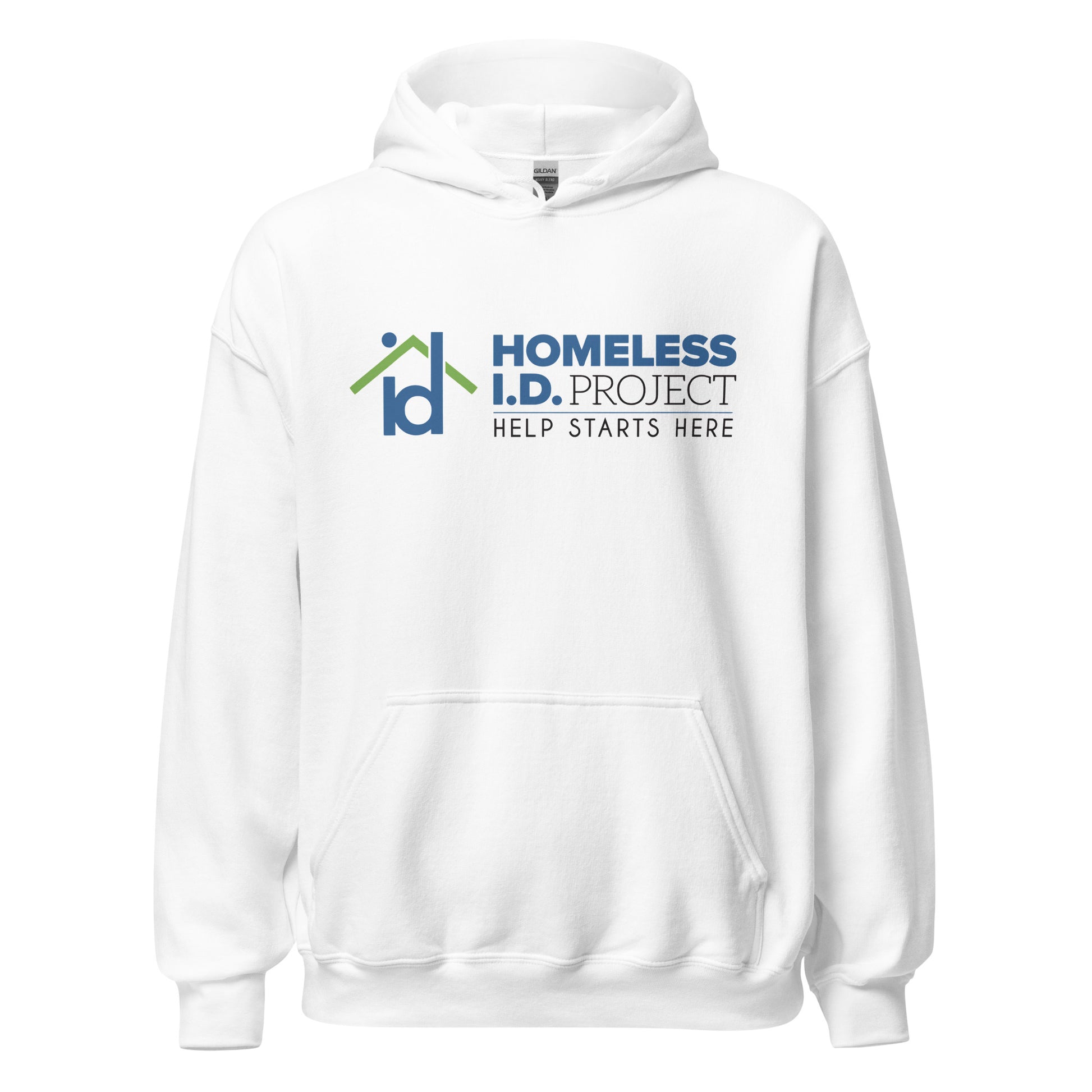 Available in white, black, blue, and gray, this unisex hooded sweatshirt features the Homeless I.D. Project logo digitally printed, pouch pocket, and drawstrings.