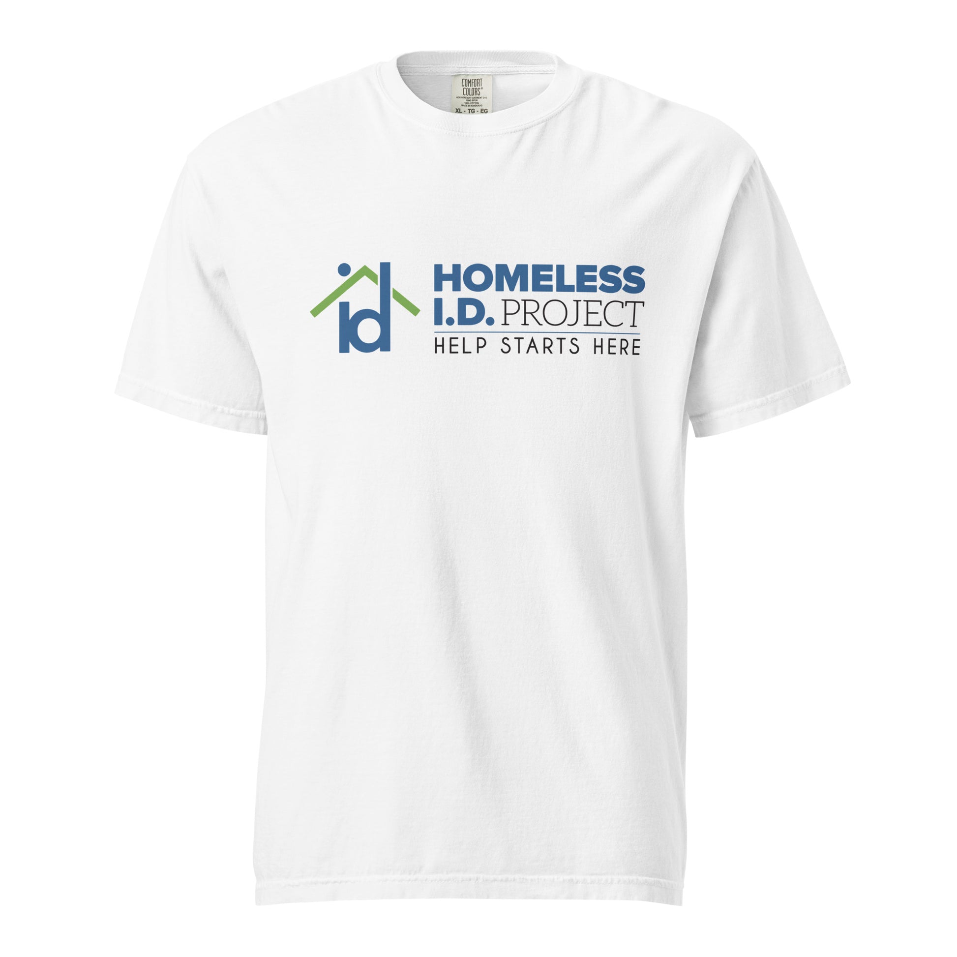 Available in black, white, and blue this unisex heavyweight tee is breathable, thick, and super soft and features the Homeless I.D. Project digitally printed.